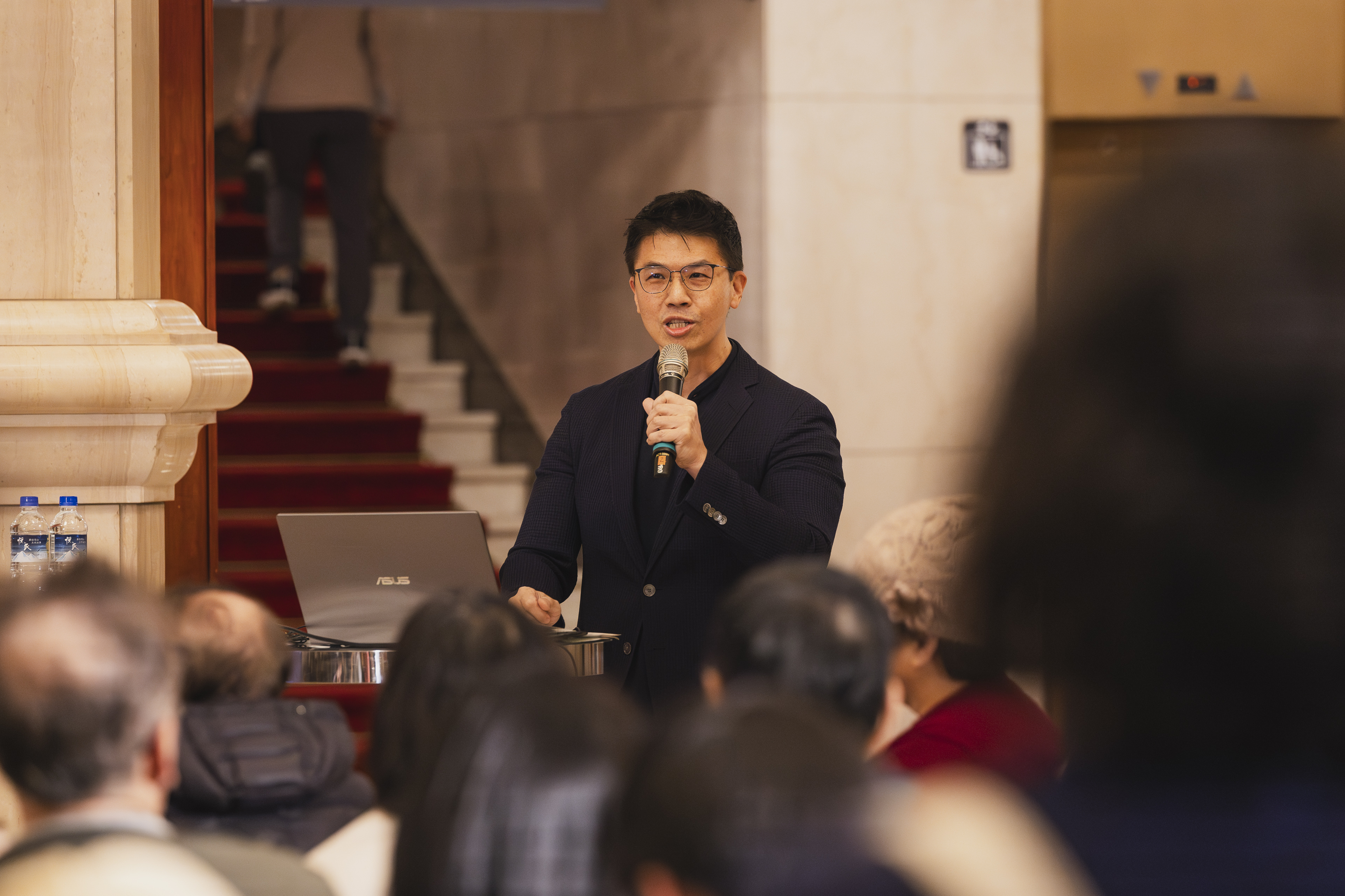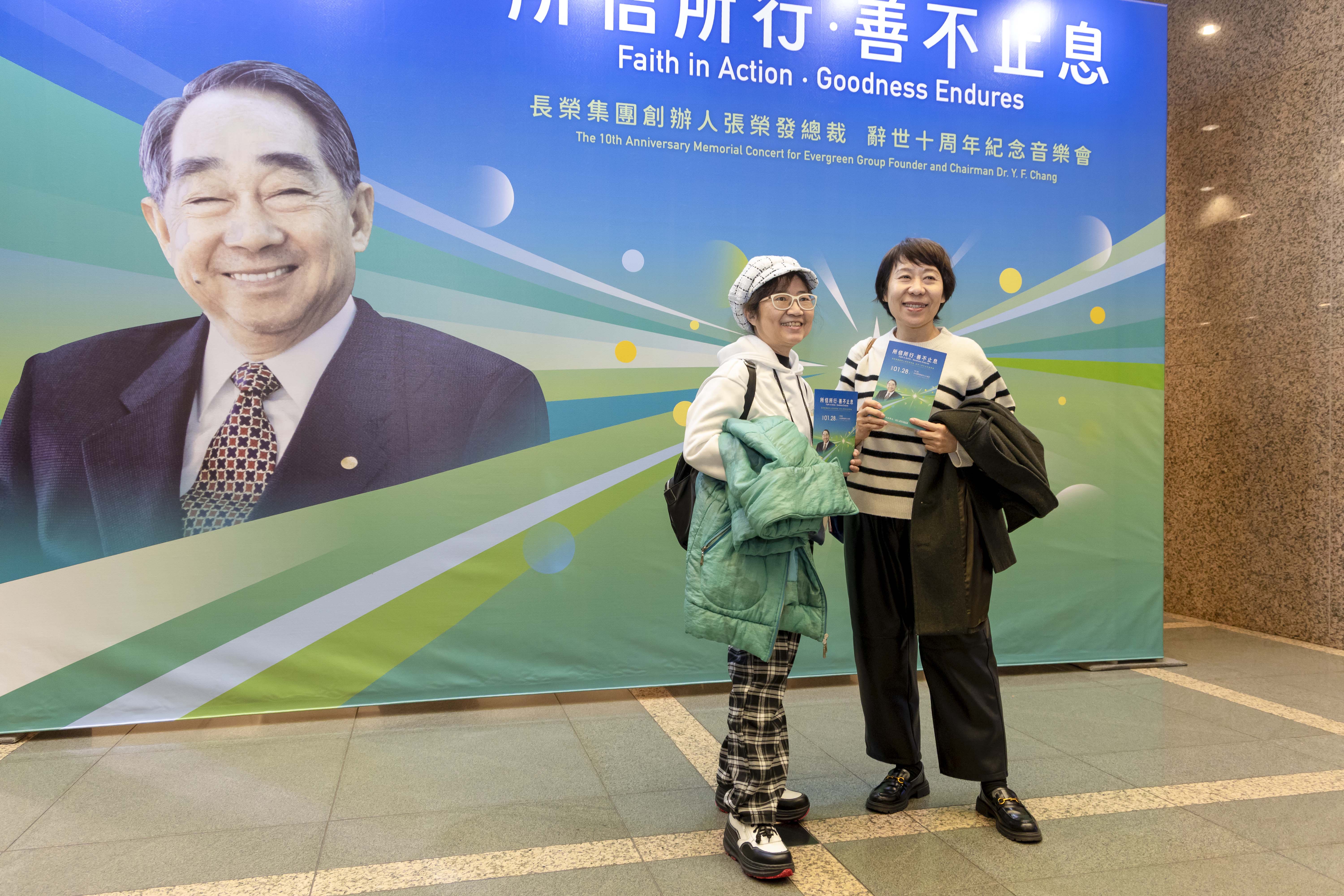 參加「所信所行‧善不止息─長榮集團創辦人張榮發總裁 辭世十周年紀念音樂會」的民眾,紛紛在主題看板前合影留念。